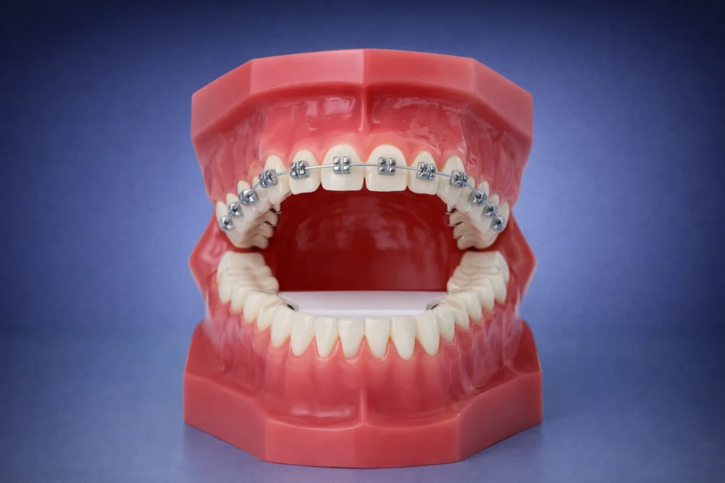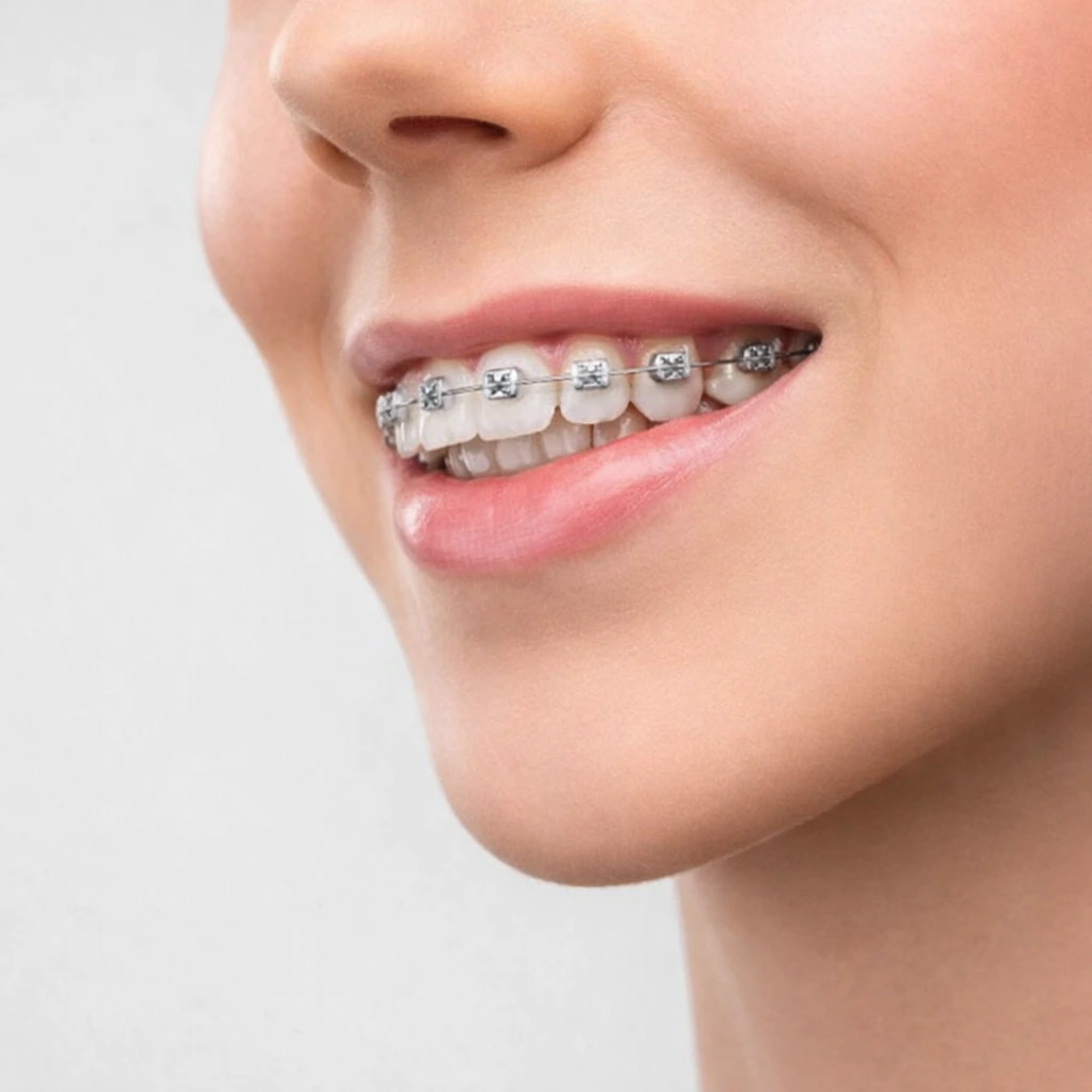 We use only high-quality imported brackets approved by the Orthodontic Society, and these steel brackets are visibly present in the mouth, making them the most commonly used type. These have a minor disadvantage in some patients prone to oral ulcers, at least for the initial period of treatment.
